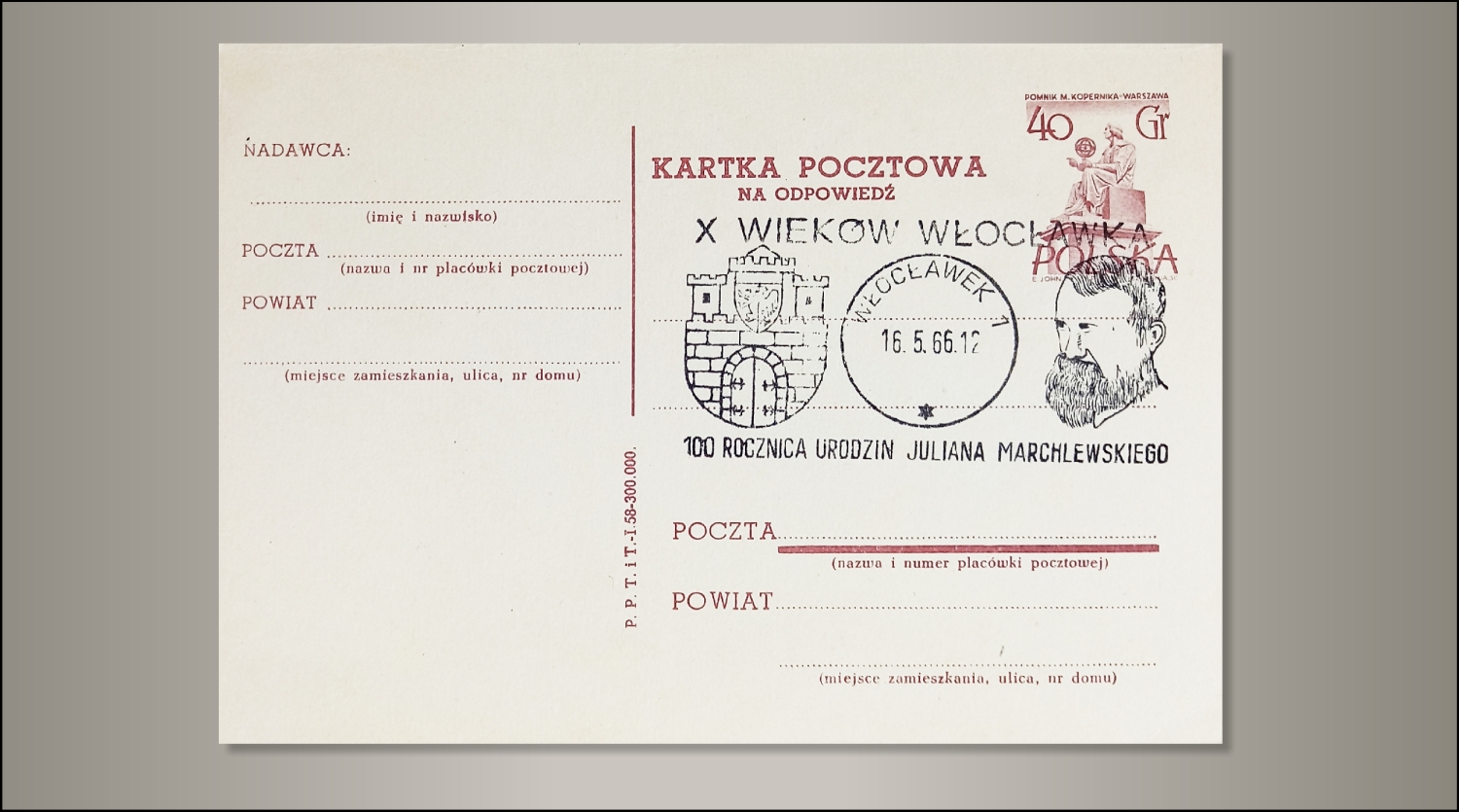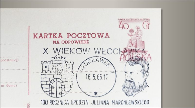 Koperty Pocztówki Znaczki Kartka pocztowa na odpowiedź 9 września, 20259 września, 2025 Muzeum Herbu 147 razy wyświetlony Karta pocztowa ze stemplem okolicznościowym z okazji X wieków Włocławka i 100. rocznicy urodzin Juliana Marchlewskiego z datownikiem na dzień 16 maja 1966 roku. Wymiary karty: 145 x 103 mm Karta pocztowa Godło Włocławka na stemplu