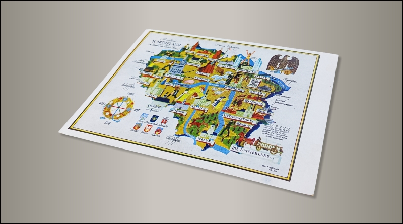 Czytaj więcejPocztówka propagandowa z okresu II wojny światowej „Wartheland”. Na odwrocie opis przedstawionej grafiki w j. niemieckim: „Serce niemieckiego wschodu, na