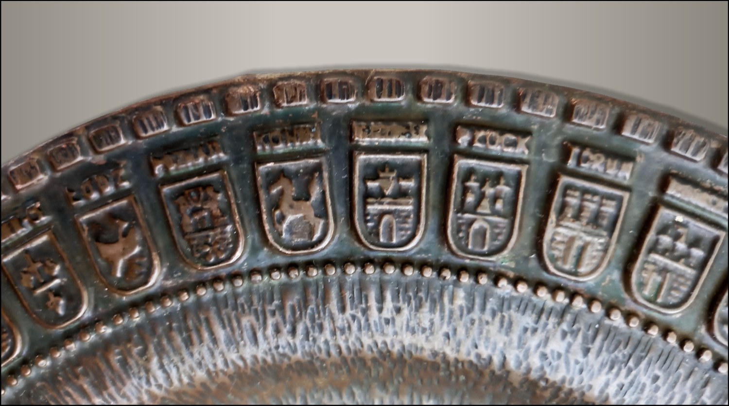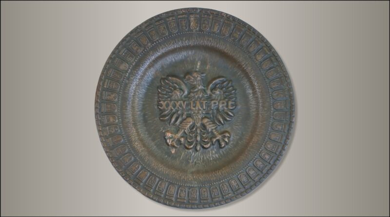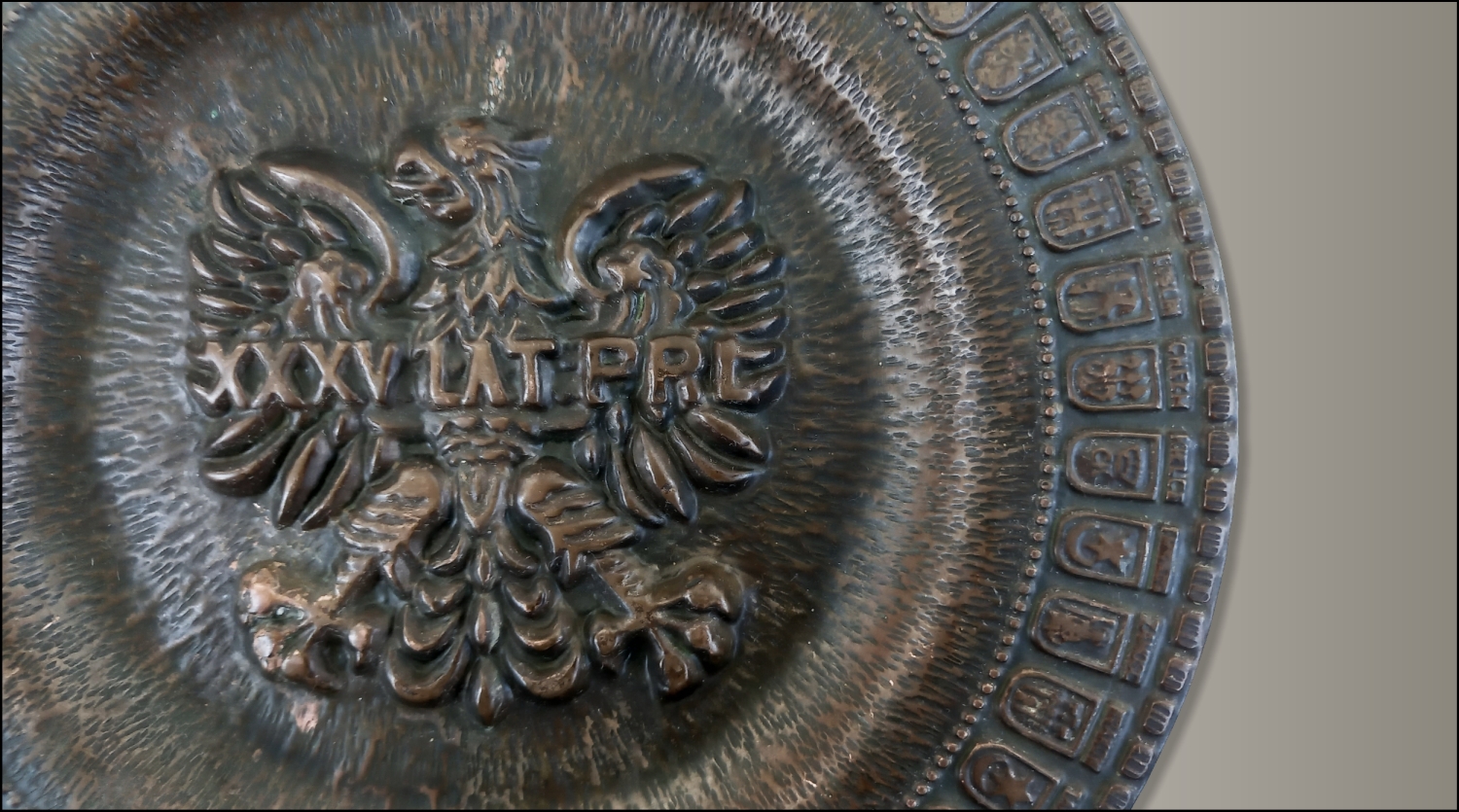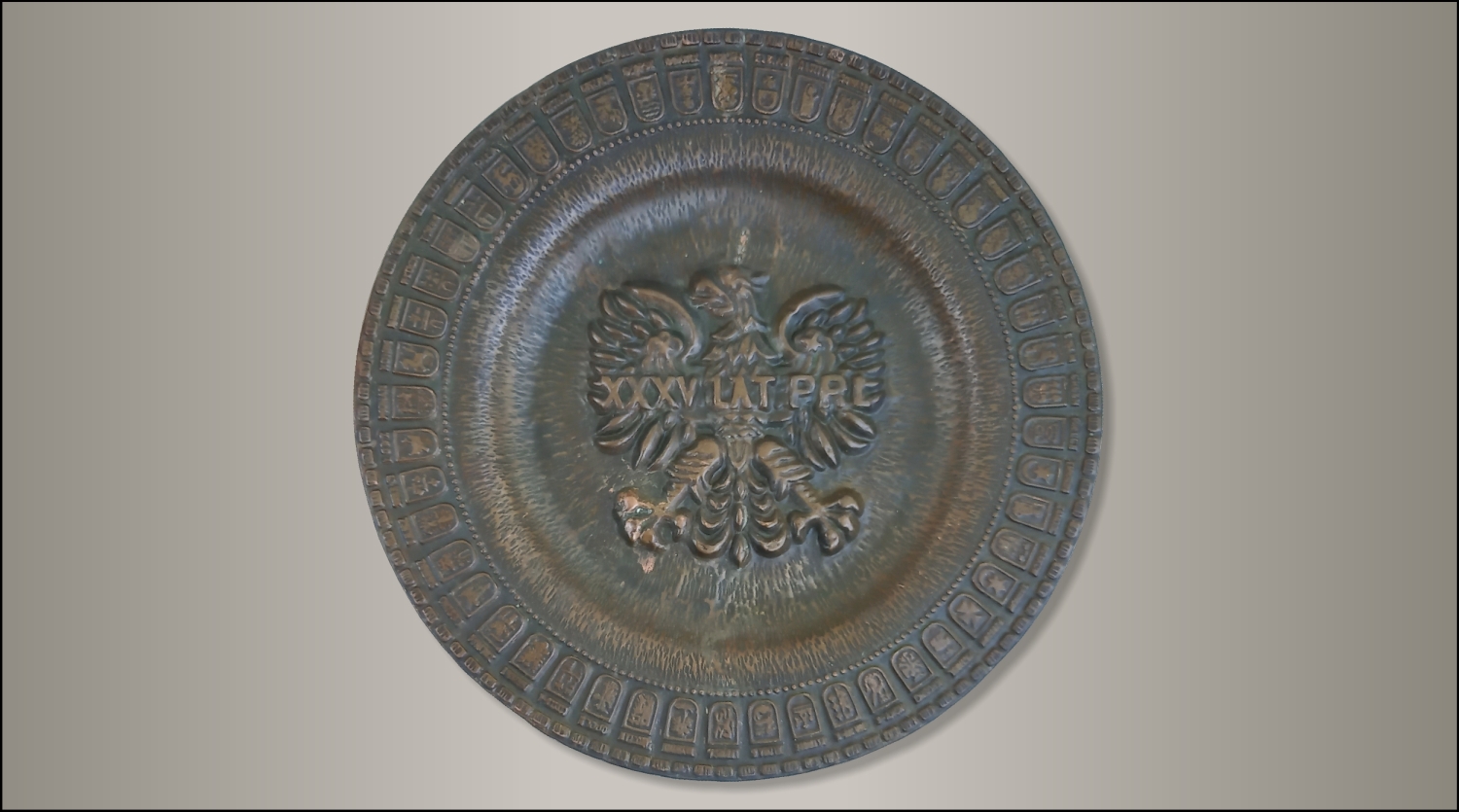 Patery Talerze Miedziany talerz z herbami miast 18 kwietnia, 202618 kwietnia, 2026 Muzeum Herbu 10 razy wyświetlony Okolicznościowy talerz z 1979 roku, wykonany z miedzi (metaloplastyka) „XXXV LAT PRL” z 49. herbami miast wojewódzkich z okresu 1975-1998 na obwodzie. W centralnym miejscu godło Polskiej Rzeczypospolitej Ludowej. Średnica: 25 cm Talerz okolicznościowy Godło PRL Herb Włocławka