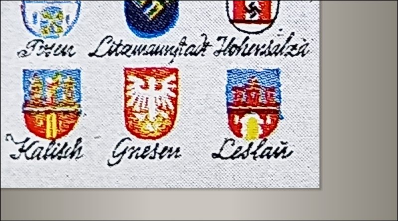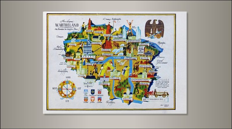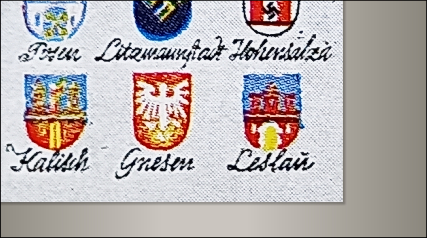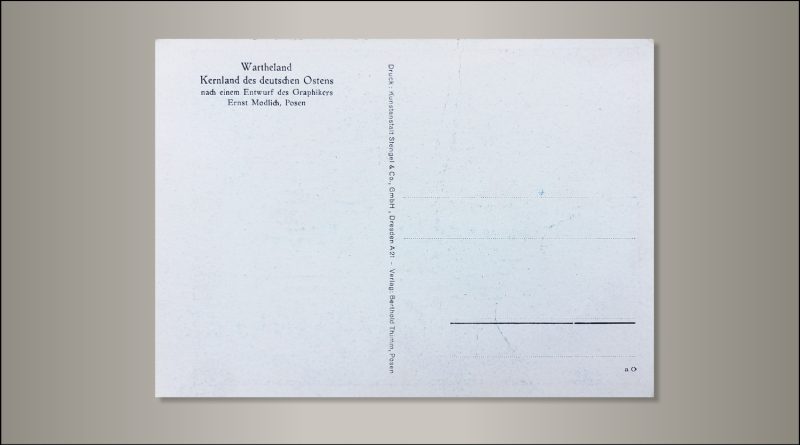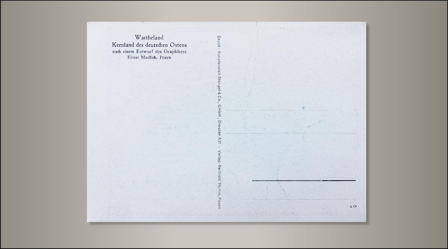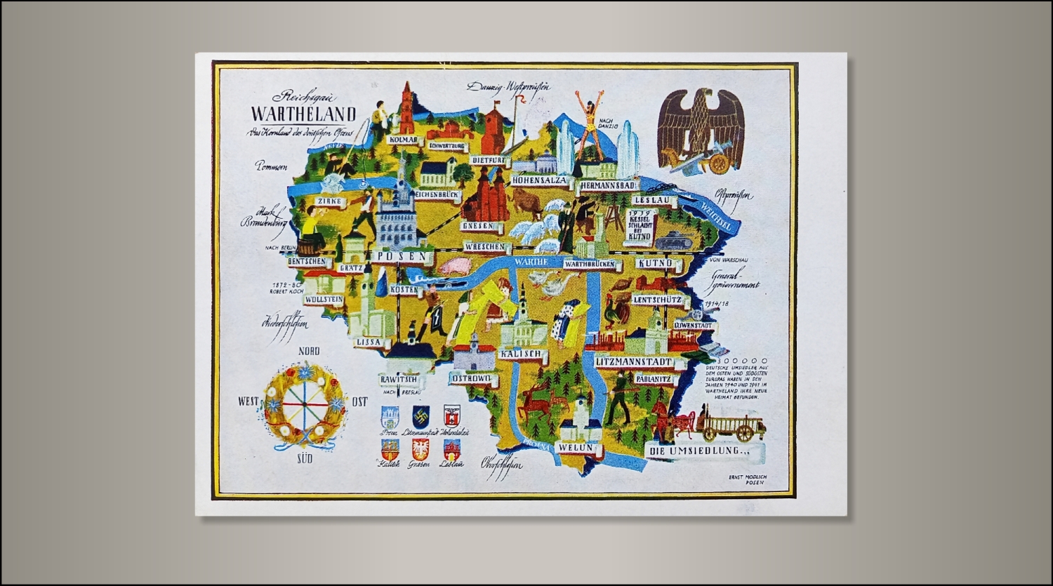 Pocztówka propagandowa z okresu II wojny światowej „Wartheland”. Na odwrocie opis przedstawionej grafiki w j. niemieckim: „Serce niemieckiego wschodu, na podstawie grafiki projektu Ernsta Modlicha, Poznań”. Pocztówka przedstawia Kraj Warty, w skład którego weszła Wielkopolska, Kujawy i ziemia łódzka. Poniżej mapki zamieszczono herby sześciu miast, m.in. Włocławka (Leslau).