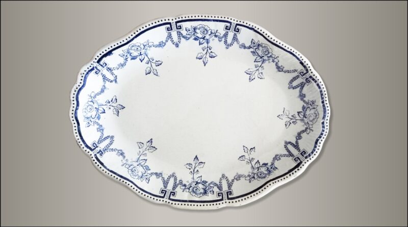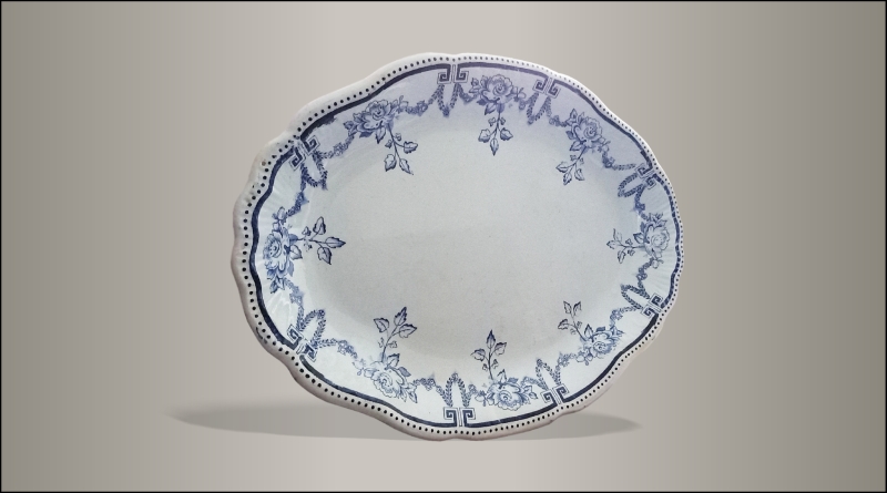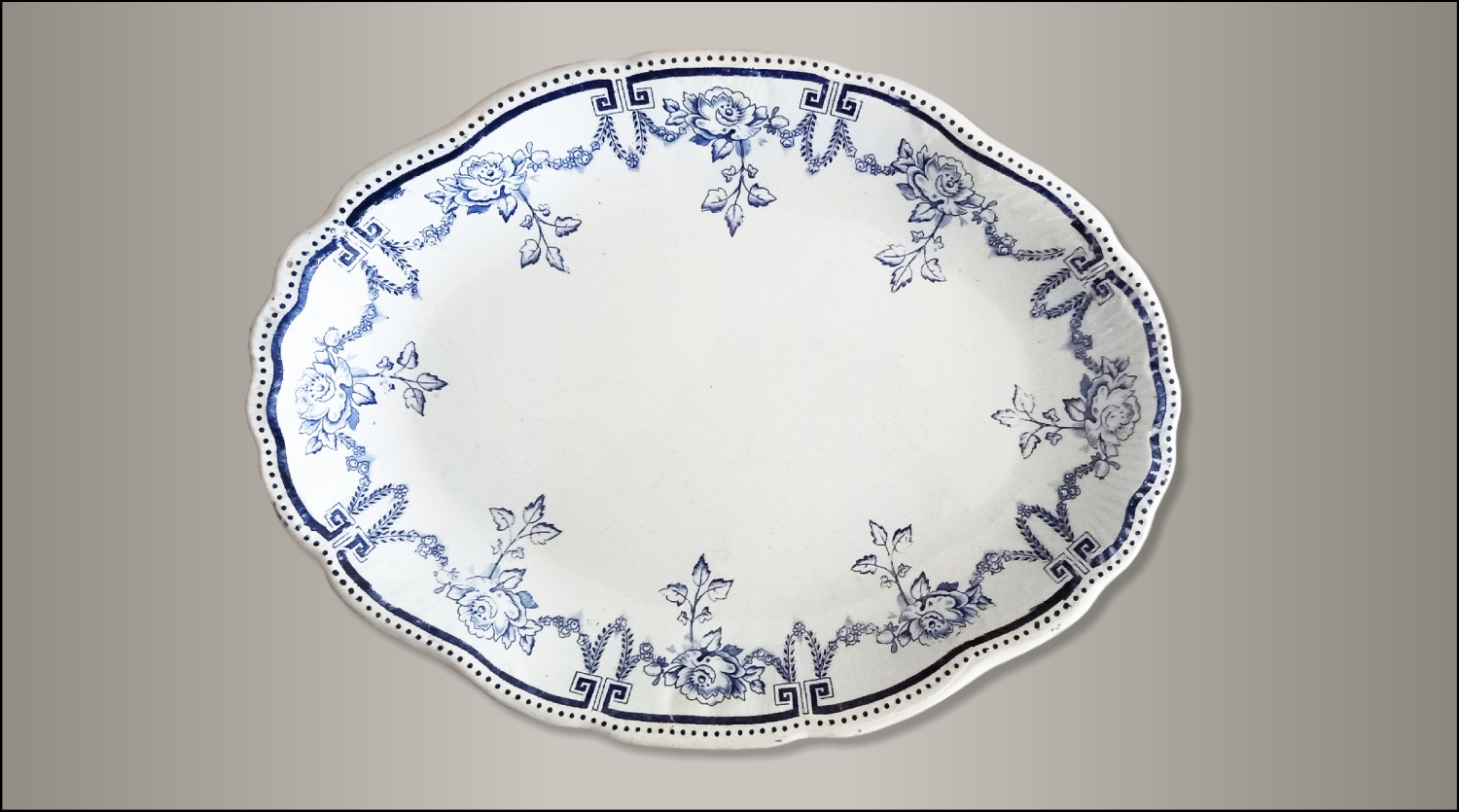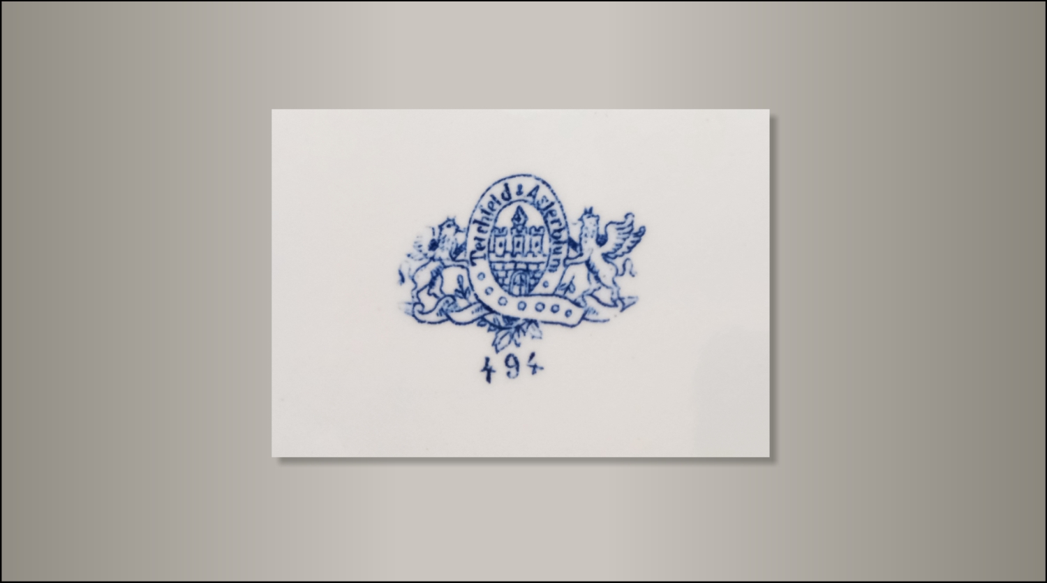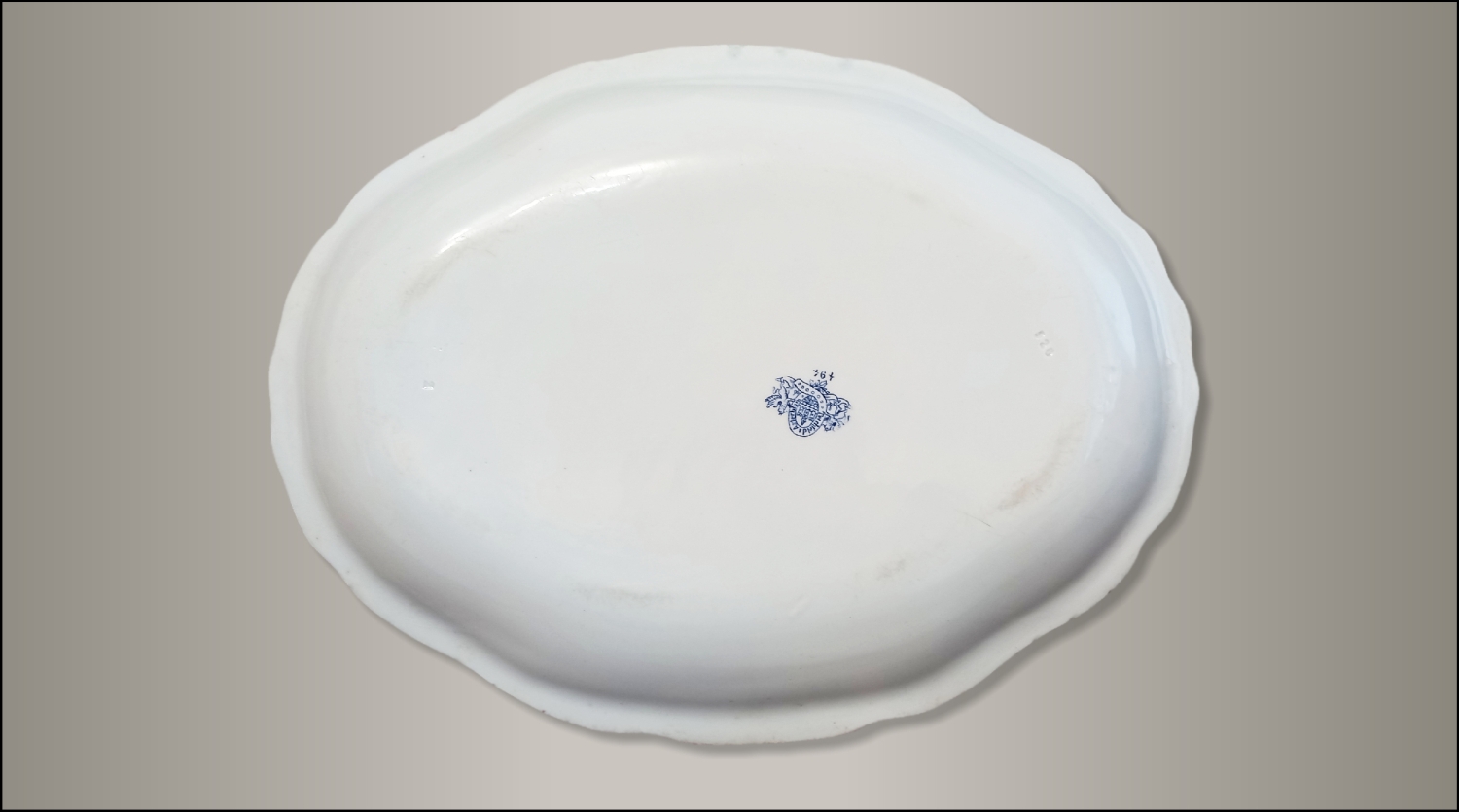 Duży półmisek wyprodukowany przez „Włocławskie Fabryki Fajansu Teichfeld i Asterblum”. Fabryka pod tą nazwą istniała w latach 1882-1918. Na sygnaturze w kolorze niebieskim zawarte jest godło Włocławka.