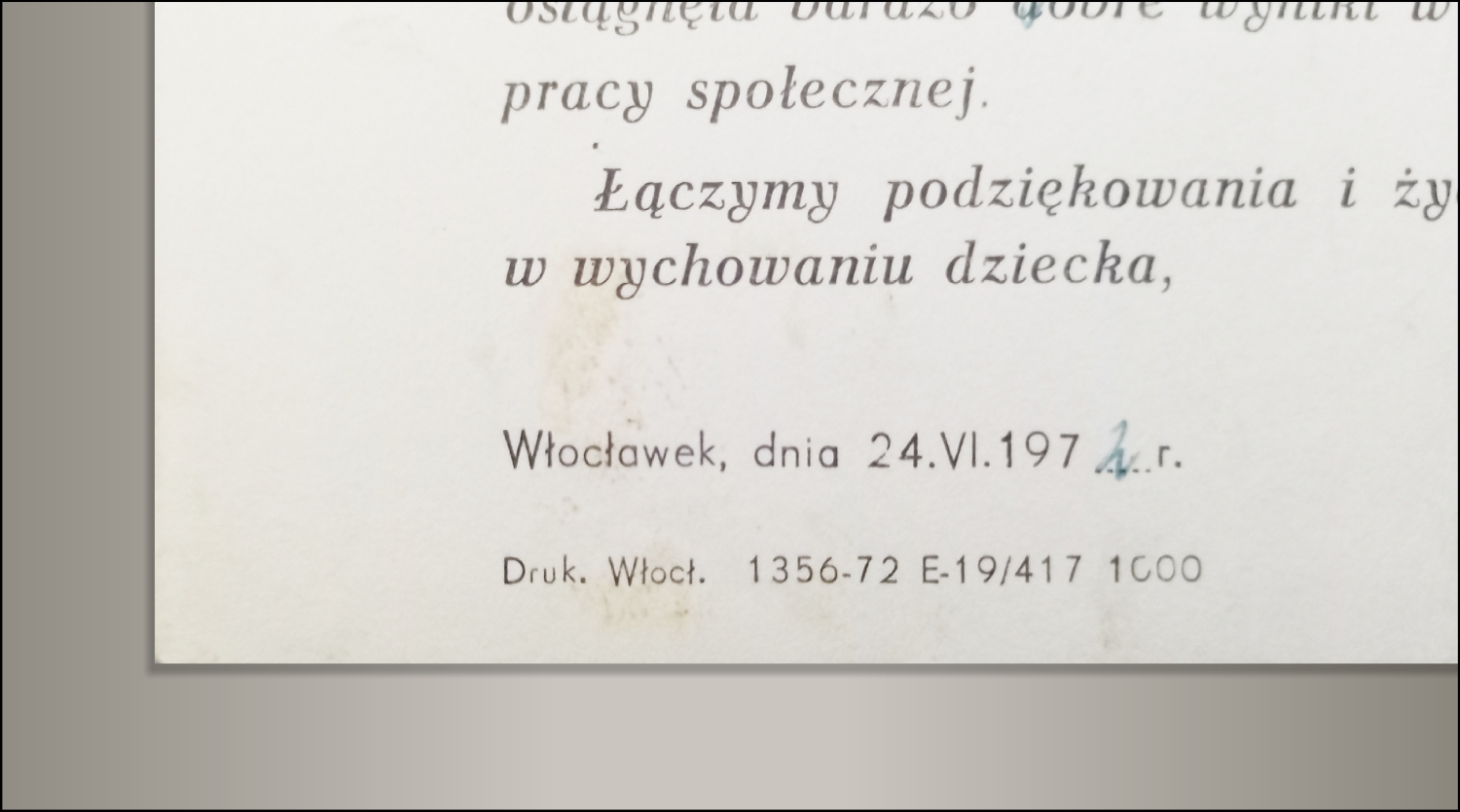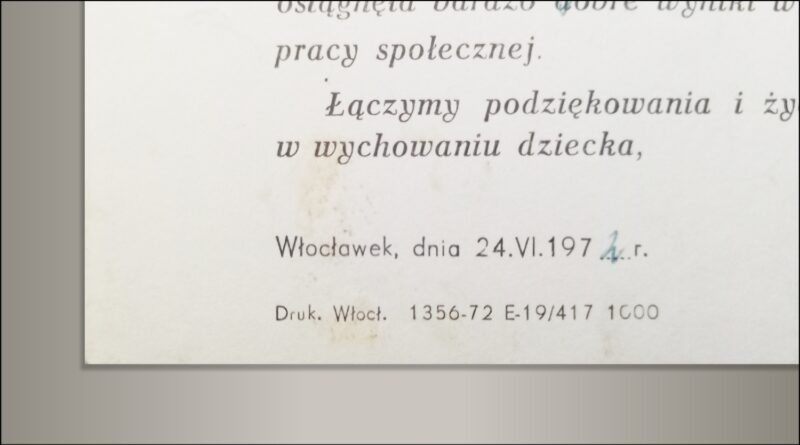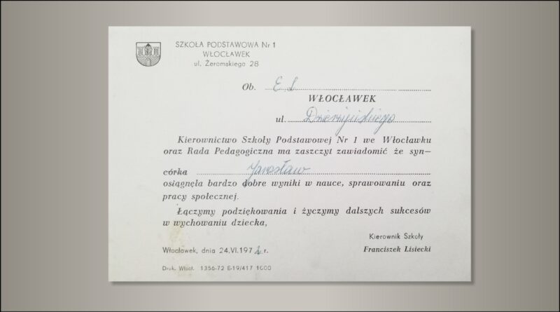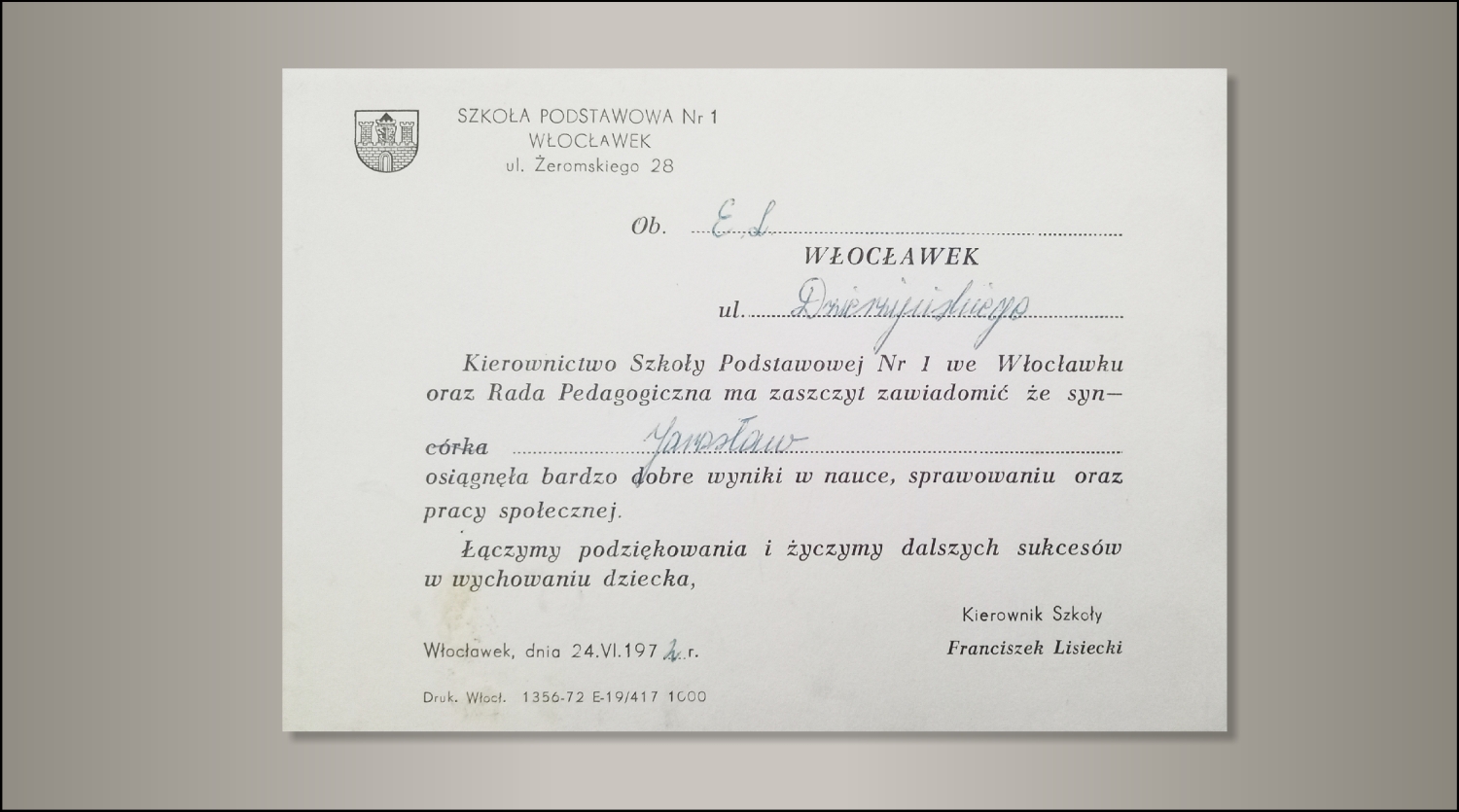 Zawiadomienie kierownictwa Szkoły Podstawowej Nr 1 i Rady Pedagogicznej dla rodziców ucznia tej szkoły o osiągnięciu bardzo dobrych wyników w nauce, sprawowaniu oraz pracy społecznej. Podziękowania i życzenia dalszych sukcesów w wychowaniu dziecka sporządzono dnia 24 czerwca 1972 roku we Włocławku.